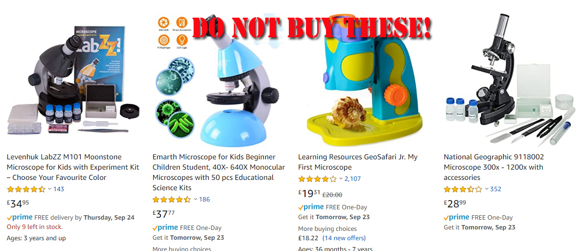 The first from the left and the one on the far right are similar. I'll tell you about these in a moment. The second one is £53.00. It even has metal objective lenses. Big deal! What is does not mention is that is has plastic lenses. Hopeless for any refined study. Plastic lenses distort images and prevent resolution and detail. But the main thing is that a microscope of this type is the wrong type for any child under 11 years of