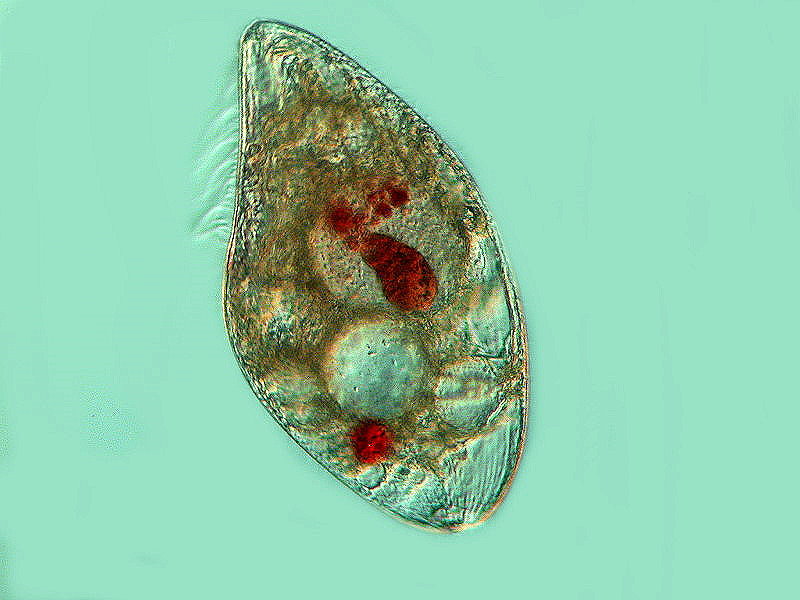 The next image shows a specimen in its more usual form, although still altered by having been stained with Methyl Green–Acetic, a stain which is particularly useful for showing up nuclear elements. Here you can very clearly see the chain macronucleus.