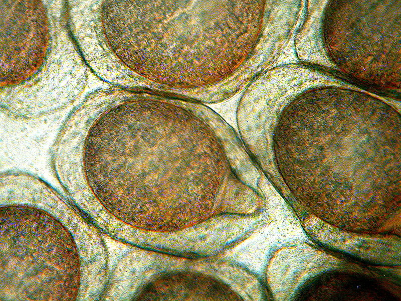 Another remarkable survival strategy is that of encystment. In this fascinating event, the organism dedifferentiates and reduces itself essentially to a highly complex “blob” of protoplasm and its genetic material. The cysts of Blepharisma are highly distinctive in their formative stages as they possess a kind of “nose cone.” First, I’ll show you a grouping of these and then a closeup, followed by a near final stage of encystment where you can see a thickening and toughening of the cyst wall. Some of the nuclear material is also visible. However, note that the vacuoles and the undulating membrane as well as an other organelles have disappeared. This thickening of the cyst wall is to ensure the protection of the content until favorable conditions are once again present so that the process can be reversed and the organism can begin to re-form its organelles. What is so extraordinary here is that the cyst wall must be able to protect against adverse conditions but, at the same time, be able to sense when the conditions are suitable for reconstitution. That is an incredible feat!