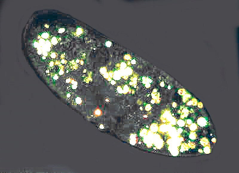 Anyway, here’s an image of Paramecium under polarization showing crystalline inclusions in vacuoles. When living specimens are examined, they look like miniature motile Christmas trees.