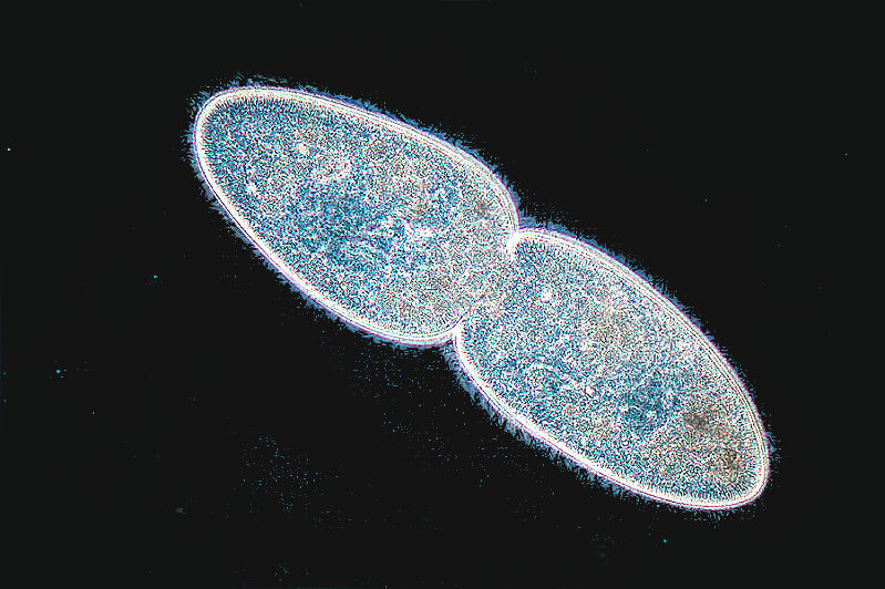 Division or binary fission is the most common form of reproduction in Paramecia. The image below is from Google and was taken by Michael Abbey. I have modified it slightly.