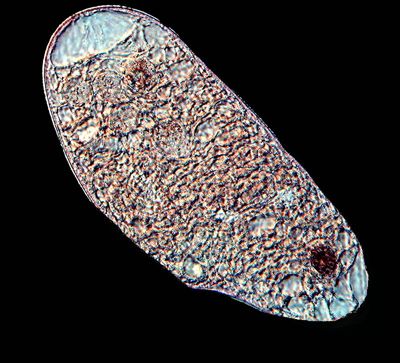 Perhaps the most fascinating aspect of Paramecium reproductive processes is one called autogamy. This can occur when acceptable mating types are not available and/or the conditions are such that conjugation is not a viable alternative. The single Paramecium then remarkably reorganizes its own genetic material in an extraordinarily complex fashion as you can see in the image below. Once again, I stained the specimen with Harris hematoxylin and I have altered the color to create a better contrast. You can see the genetic material scattered in strands throughout the organism.