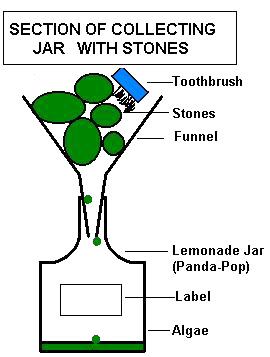 One day when I found an underwater wall of rock covered in slimy diatoms. I realised that I had all I needed in my rucksack. If a flat plastic bath sponge is held firmly against the rock below the surface and is wiped in an upward direction until it emerges from the water, it becomes impregnated with the growth which can then be squeezed out into an empty 'Panda' ® type pop or lemonade bottle. The addition of a small plastic funnel completes the apparatus.