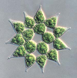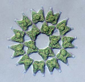 Figure 4.>>> Pediastrum duplex has bright green chloroplasts within each cell for photosynthesis. Phase contrast, 40x objective (65 microns in diameter). |
