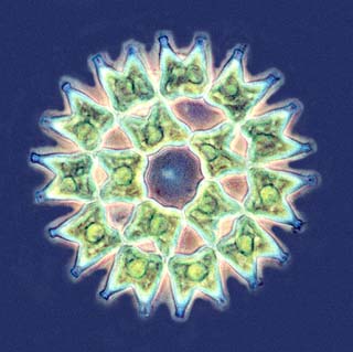 <<<Figure 2. Pediastrum simplex, a fascinating "shining star" when imaged by phase contrast microscopy. 40x objective (90 microns in diameter). |