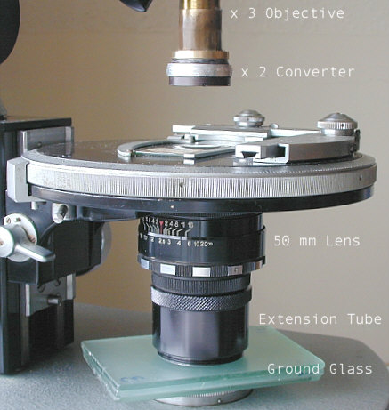 Sometimes even our lowest power objectives such as the x3 or x2.5 provide too much magnification for some specimens which cannot be encompassed within the field of view. This has happened to us all at some time, and whether we are simply observing or more likely taking photographs through the instrument, a reduction in image scale would be very convenient.Here I describe a simple method which although unconventional works admirably, using a x2 or x3 lens converter of the sort used in 35 mm photography. They are normally placed between the camera's body and the lens, and increase the effective focal length of the camera's lens by factors of x2 or x3.