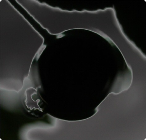 Image of a small apple converted to black and white with light grey 'neon glow' and extreme contrast applied.
