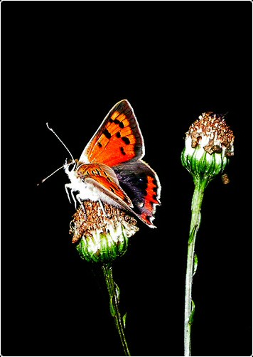 A small copper butterfly taken with close-up flash and extreme contrast applied.