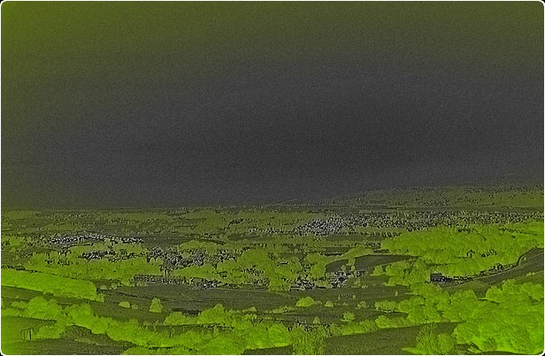 Wide angle shot of nearby fields, trees and farms, several effects applied here including 'neon glow'.