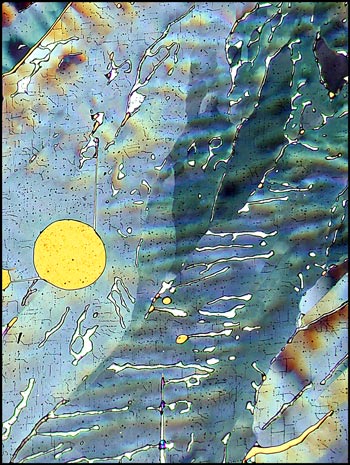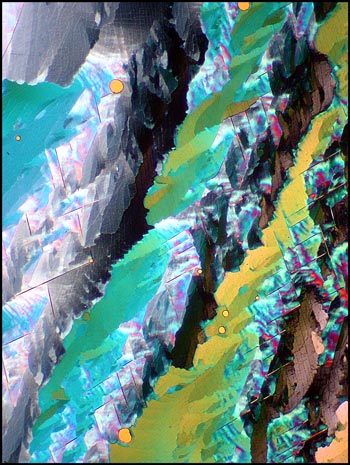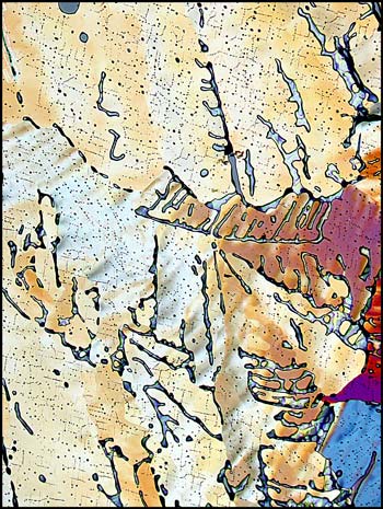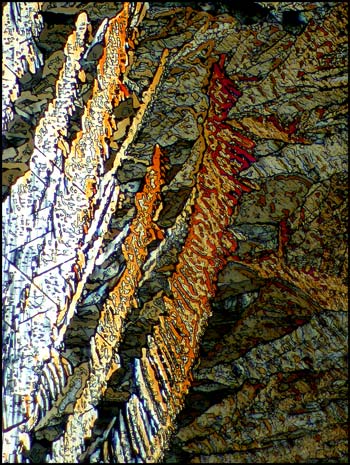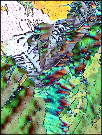 Crossed polars were used in all polarized light images, and compensators, (quarter and whole wave plates), were used to alter the colour spectrum in some images. The variations possible using this technique are many, as can be seen in the three images below of an interesting area of the slide.