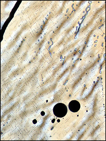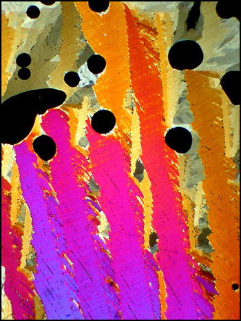 Many potassium chlorate melt specimens have bubbles which show as black in crossed polar photomicrographs. These blemishes can be seen in the two images below. As a chemistry teacher, I look upon the bubbles, not as an absence of potassium chlorate, but as the presence of small pockets of pure oxygen gas. As the compound is heated to the molten state (at 370°C), it is not difficult to bring the substance to the boil (at 400°C) at which temperature decomposition begins to take place. One of the decomposition products is oxygen gas. If instead of a Bunsen burner, a hot plate was used to melt the compound, greater control of the temperature could prevent this occurrence.