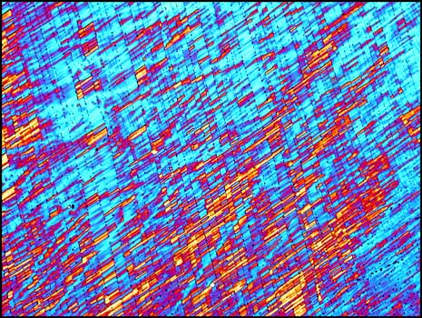 The first image in the article and the following two, show a distinctive characteristic of most melt specimens of the compound. Notice the sets of parallel fractures which sometimes form parallelogram shapes in the sample. These structures seem to occur on two different scales: one, on a larger scale which can be seen as light lines in the image on the left below, and one on a much smaller scale which can be seen as dotted finer lines in the same image.