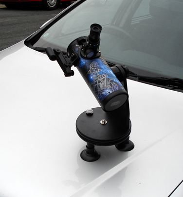The instrument is a compact 76mm diameter reflecting telescope with a focal length of 300mm. It is attached to a mini- Dobsonian mount, and comes with two remarkably good modified achromat eyepieces (25mm and 10mm) giving magnifications of x16 and x30, respectively. There is also a separate finder scope which is attached to the side of the optical tube assembly by means of two screws. I made two modifications to this set as shown in figure 1. First I added three large rubber suction cups to the base feet which not only increased stability, but also enabled me to attach the scope to inclined surfaces, such as the bonnet of my car whilst out and about (Figure 1a). Second, I replaced the relatively simple optical finderscope with a little electronic device known as a red dot finder which made locating objects in the night sky a lot easier to do.