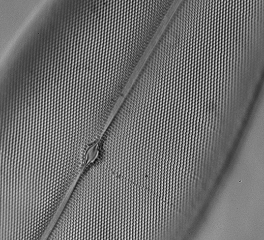 Diatom, slide label "Frustulia rhomboides", 8 form test slide, but correctly Frustulia saxonica Rabenhorst (see Frithjof Sterrenburg's article which discusses the history of both the misidentification and incorrect nomenclature of this popular test diatom). Zeiss 63X/1.4 oblique using offset brightfield port in phase condenser. The diatom long axis is ca. 45 degrees to direction of oblique. Single shot using Opticstar PL-130M 1.3 Mpixel monochrome C-mount camera, MICAM image capture software.