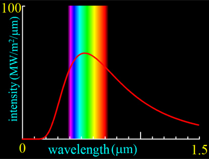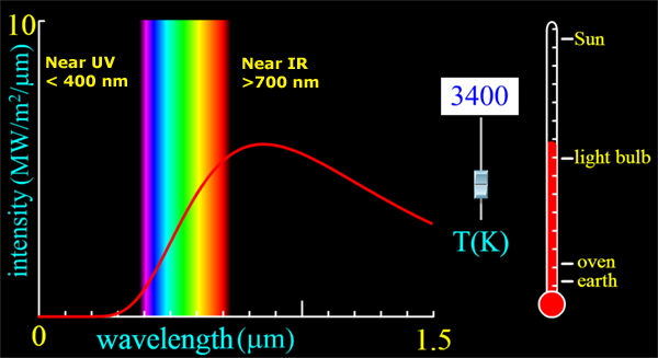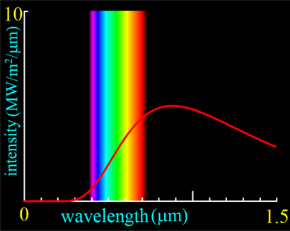 Above: The spectrum of a black body radiating at 3400K i.e. the cited colour temperature of a tungsten lamp operating at 12V 100W (Zeiss Photomicroscope manual). Created using the Java black body spectrum simulation (an interactive web page). Credit: PhET Interactive Simulations, University of Colorado http://phet.colorado.edu