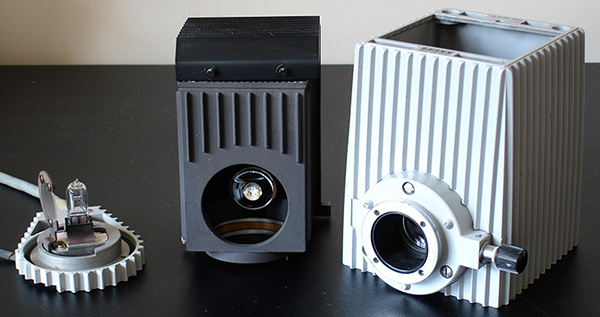 The 12V 60W lamphouse using a tungsten bulb with large flat filament. These bulbs are a little more expensive but quite good value ($15+ in US). These can be more sensitive to mechanical breakage but with care can last years, this example is over 5 years old. Again the lamphouse is carefully crafted with centering and focussing for optimal Köhler. The small 12V 100W tungsten-halogen bulbs are cheap, work but are rather characterless. These larger bulbs with their large spherical envelopes have a certain appeal in the same way that valve audio amplifiers do.