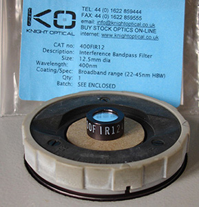 Right: An interference 400 nm filter with 45 nm half bandwidth. As these studies are typically made at higher mags e.g. 40X and higher, the filter only has to be large enough to fill the field iris aperture set for the lowest mag chosen, thus allowing the smaller cheaper grades to be bought. A card annulus blocks any residual light from the edges.