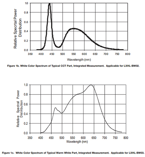 Upper right is the typical spectrum of a white LED, cited as having a 'typical' colour temp. of 5500K. The equivalent black body temp. is shown upper left. Lower right is the same maker's 'warm white' with a markedly lower blue spike, 'typical' color temp. cited as 3300K. The equivalent black body temp. is shown lower left. Source: Philips Lumileds Luxeon Emitter Technical Datasheet DS25. Note that these are not necessarily normalised for same y axis units, but are illustrative. The overlain normalised spectra presented e.g in the Olympus BX46 brochure below are similar. |