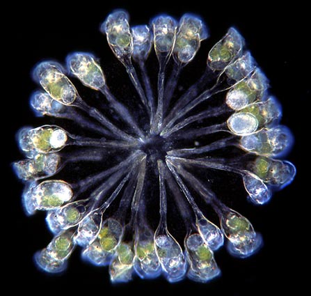 | This picture shows many of the individuals carrying eggs. After development the young individuals will join the colony or leave to start a new colony. |