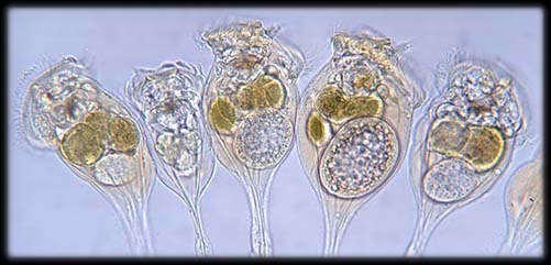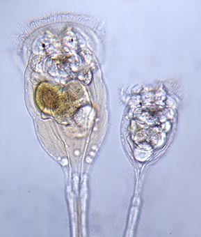 An adult and youngster of Conochilus unicornis, photographed with a 25X obj. showing the various internal organs. |