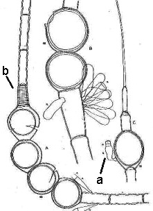 Figure 3. a) dwarf male, b) note projection inside filament.