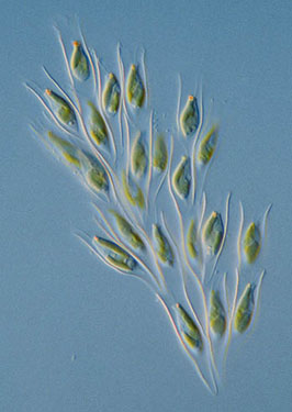 inconspicuous free swimming branching colonies of bi-flagellated freshwater