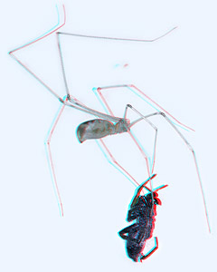 Most people don't realise that you don't have to leave the house to witness wildlife in action. Most toilets and cellars of our homes are inhabited by one of the most elusive hunters in the animal kingdom. It is the 'daddy-long-legs spider', Pholcus phalangioides. The name 'daddy-long-legs spider' is a bit confusing. These spiders look a bit like daddy-long-legs, i.e. the Crane-flyTipula, but these have wings. They also resemble the long-legged harvestmen of the family Phalangiidae(!) (also often called daddy-long-legs) but if you watch these closely you can see that the head, thorax and abdomen is fused. In spiders there is a clear distinction between the head/thorax region and the abdomen. Perhaps a better name that is been used is 'long-legged cellar spider'. The family of the Pholcidae normally inhabits warmer regions but Pholcus phalangioides is cosmopolitan finding shelter in the warmth of our houses. Most of the time Pholcus can be found hanging upside down in a loose web in the corner of the ceiling. Its strategy is to remain motionless until a prey passes. And its prey is not what you would expect. It eats mostly other spiders. One of the spiders it eats is the much larger house-spider of the genus Tegenaria , the large hairy funnel-web spider that is one of the main causes of 'arachnophobia', the fear of spiders. So if you hate spiders, take a daddy-long-legs spider as a pet! |
