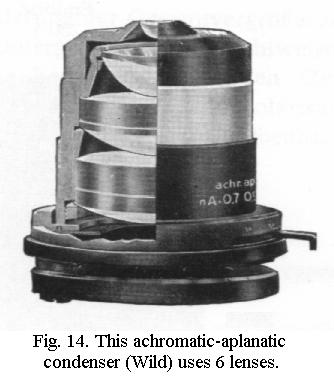 A better type is the aplanatic condenser, which is much less expensive than the top of the range, an achromatic-aplanatic condenser (Fig. 14), yet yields good illumination. An aplanatic condenser of NA 0.9 is much better than an uncorrected one of NA 1.2. Highly corrected condensers are easily recognized because the degree of correction is engraved on the mount.